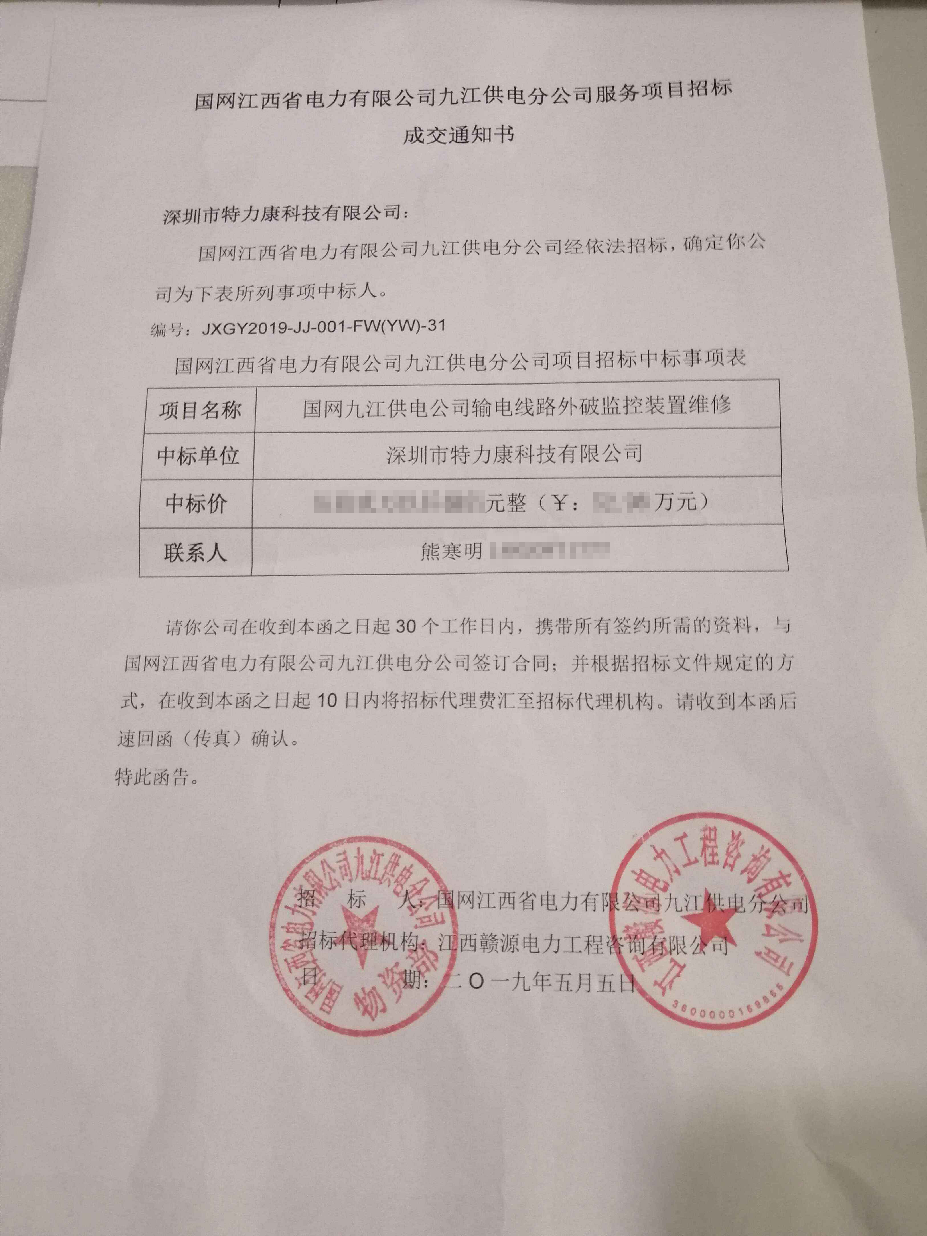 國(guó)網(wǎng)江西九江供電有限公司輸電線(xiàn)路防外破監(jiān)控裝置采購(gòu)項(xiàng)目評(píng)審工作已結(jié)束,經(jīng)評(píng)審委員會(huì)評(píng)審,經(jīng)國(guó)網(wǎng)江西九江供電有限公司招投標(biāo)領(lǐng)導(dǎo)小組批準(zhǔn),我司被確定為此次輸電線(xiàn)路防外破監(jiān)控裝置采購(gòu)項(xiàng)目中標(biāo)單位現(xiàn)將公告公示。