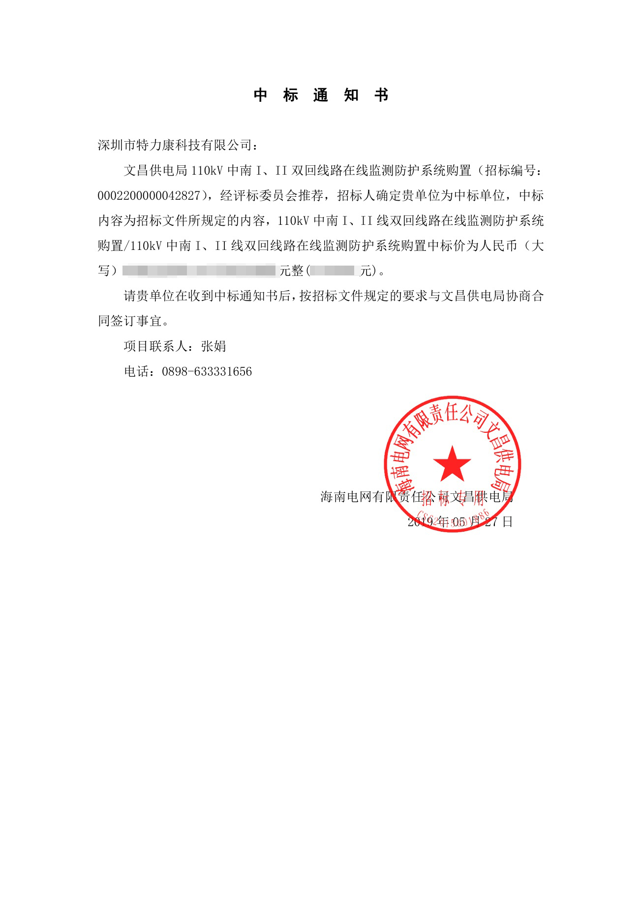 經(jīng)評標(biāo)委員會推薦,文昌招標(biāo)單位,確定我司(深圳市特力康科技有限公司)為文昌供電局雙回線在線監(jiān)測防護(hù)系統(tǒng)項(xiàng)目中標(biāo)單位,現(xiàn)將中標(biāo)公告公示。