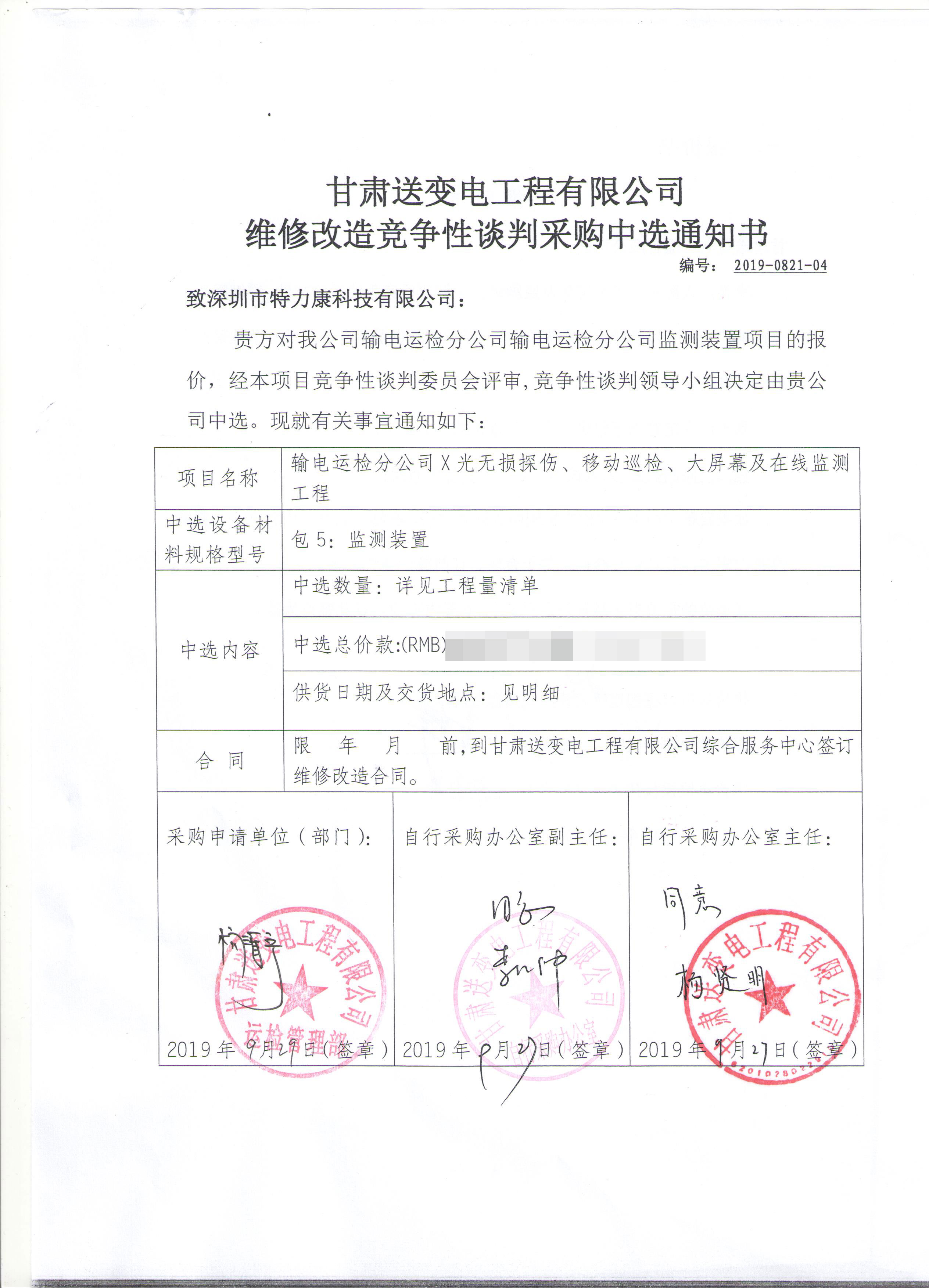 經(jīng)審委員會根據(jù)招標(biāo)程標(biāo)次評審、對有效標(biāo)書認(rèn)真評審,競爭性談判領(lǐng)導(dǎo)小組確定我司為甘肅送變電工程有限公司維修改造競爭性談判采購項目中標(biāo)單位。