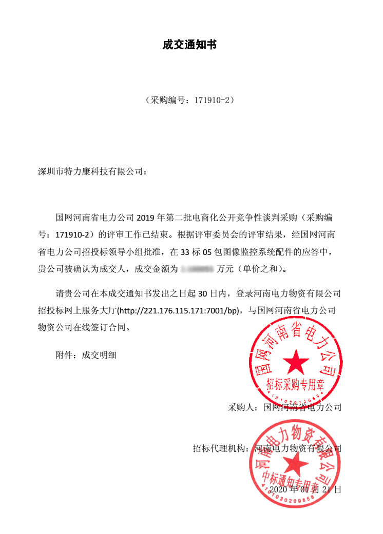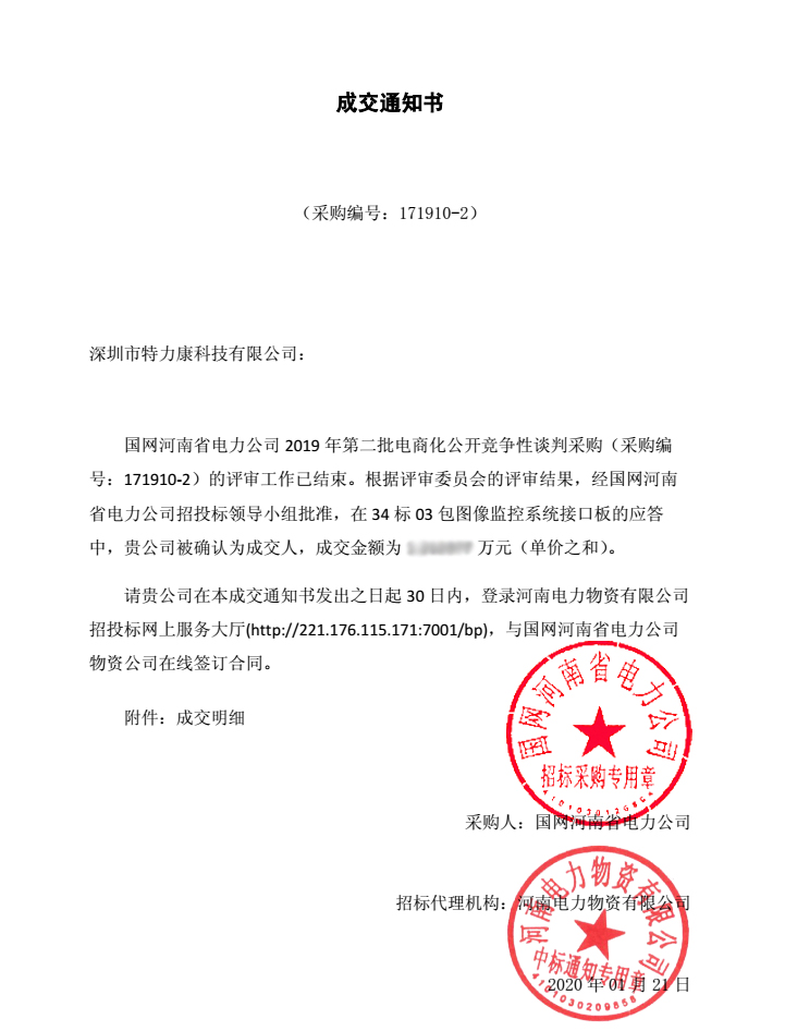國網(wǎng)河南省電力公司2019年第二批電商化公開競爭性談判采購(采購編號: 171910-2) 談判工作已結(jié)束,經(jīng)評審委員會評審,并報公司招投標(biāo)工作領(lǐng)導(dǎo)小組批準(zhǔn),我司中標(biāo)國網(wǎng)河南省電力公司2019年第二批電商化公開競爭性談判采購33標(biāo)05包圖像監(jiān)控系統(tǒng)配件及34標(biāo)03包圖像監(jiān)控系統(tǒng)接口板,中標(biāo)通知如下: