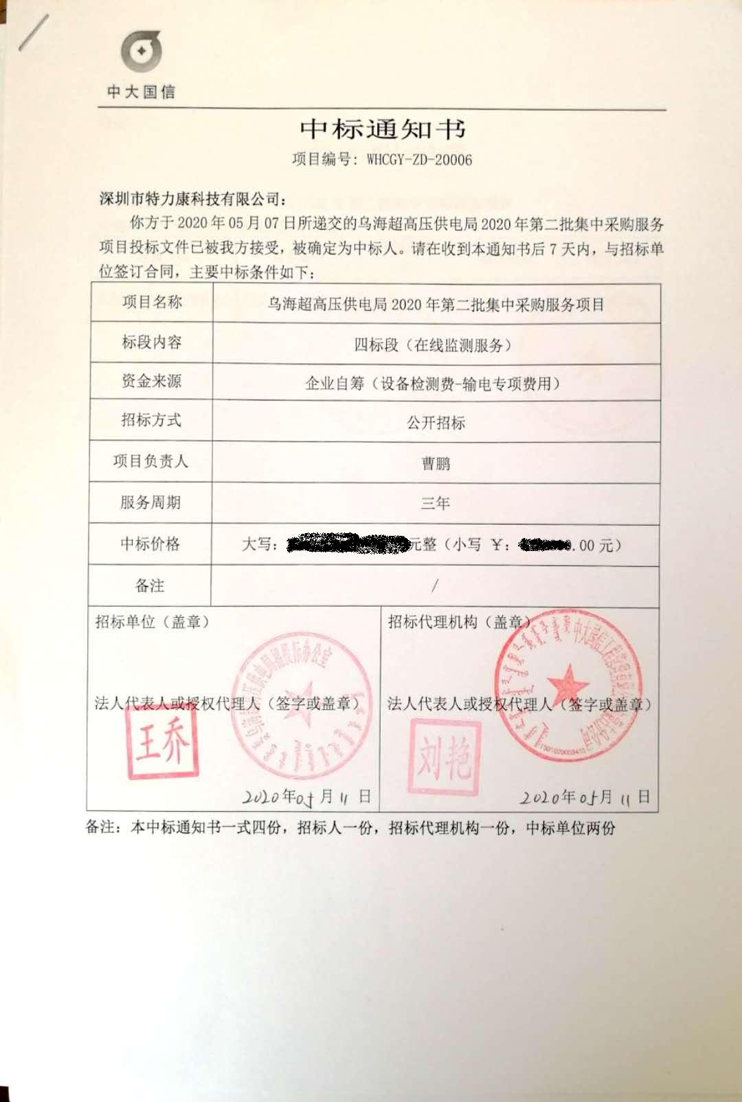 經(jīng)招標(biāo)領(lǐng)導(dǎo)組批準(zhǔn),我司于2020年05月07日所遞交的烏海超高壓供電局2020年第二批集中采購服務(wù)項(xiàng)目(四標(biāo)段:在線監(jiān)測服務(wù))投標(biāo)文件已被局方接受,被確定為中標(biāo)人。特發(fā)中標(biāo)通知書,如下: