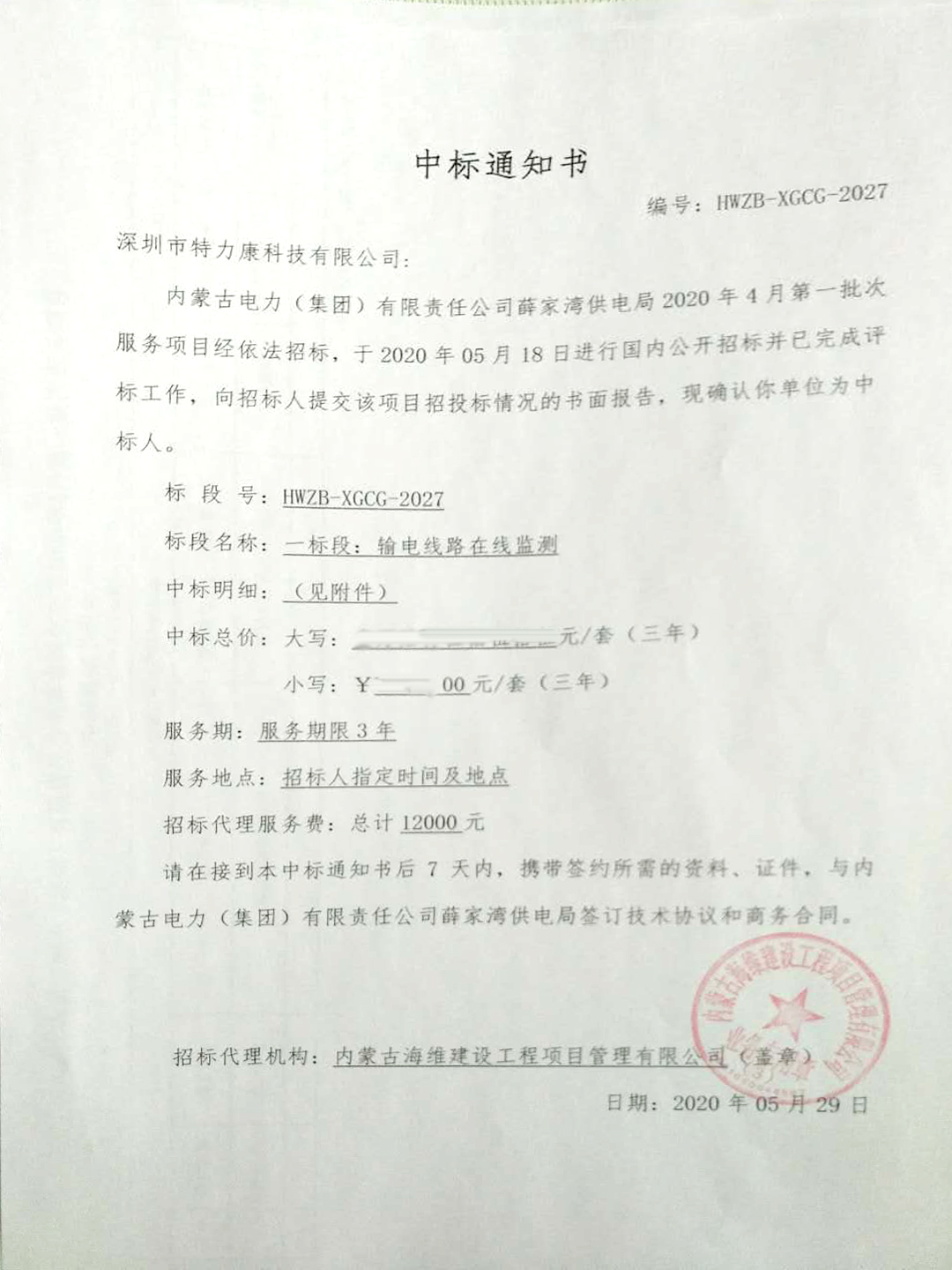 內(nèi)蒙古電力(集團(tuán))有限責(zé)任公司薛家灣供電局2020年4月第一批次服務(wù)項(xiàng)目(一標(biāo)段:輸電線路在線監(jiān)測(cè))經(jīng)依法招標(biāo),于2020年05月18日進(jìn)行國內(nèi)公開招標(biāo)并已完成評(píng)標(biāo)工作,向招標(biāo)人提交該項(xiàng)目招投標(biāo)情況的書面報(bào)告,現(xiàn)確認(rèn)我司(深圳市特力康科技有限公司)為中標(biāo)人。特發(fā)中標(biāo)通知書,如下: