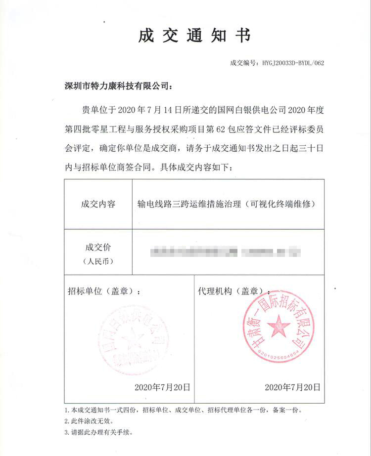 我司于2020年7月14日參加了國網(wǎng)白銀供電公司2020年度第四批零星工程與服務授權采購項目第62包輸電線路三跨運維措施治理(可視化終端維修)的投標工作,所遞交的應答文件經評標委員會評定,確定我司(深圳市特力康科技有限公司)是成交商,具體成交內容如下: