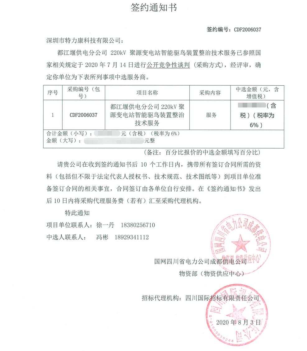 2020年7月14日我司(深圳市特力康科技有限公司)參加的都江堰供電分公司220kV聚源變電站智能驅(qū)鳥裝置整治技術服務,已參照國家相關規(guī)定進行公開競爭性談判(采購方式),后經(jīng)專家評審,確定我司為都江堰供電分公司220kV聚源變電站智能驅(qū)鳥裝置整治技術服務中選服務商。特發(fā)簽約通知書如下: