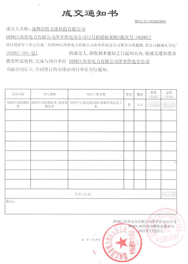 國(guó)網(wǎng)江西省電力有限公司萍鄉(xiāng)供電分公司12月份授權(quán)采購(gòu)(批次號(hào): 1820EC)項(xiàng)目的評(píng)審工作已結(jié)束。經(jīng)國(guó)網(wǎng)江西省電力有限公司萍鄉(xiāng)供電分公間領(lǐng)導(dǎo)小組批準(zhǔn),我司(深圳市特力康科技有限公司)被確認(rèn)為包1820EC- 101-包1(線路在線監(jiān)測(cè)裝置,覆冰監(jiān)測(cè)系統(tǒng))的成交人,成交通知如下: