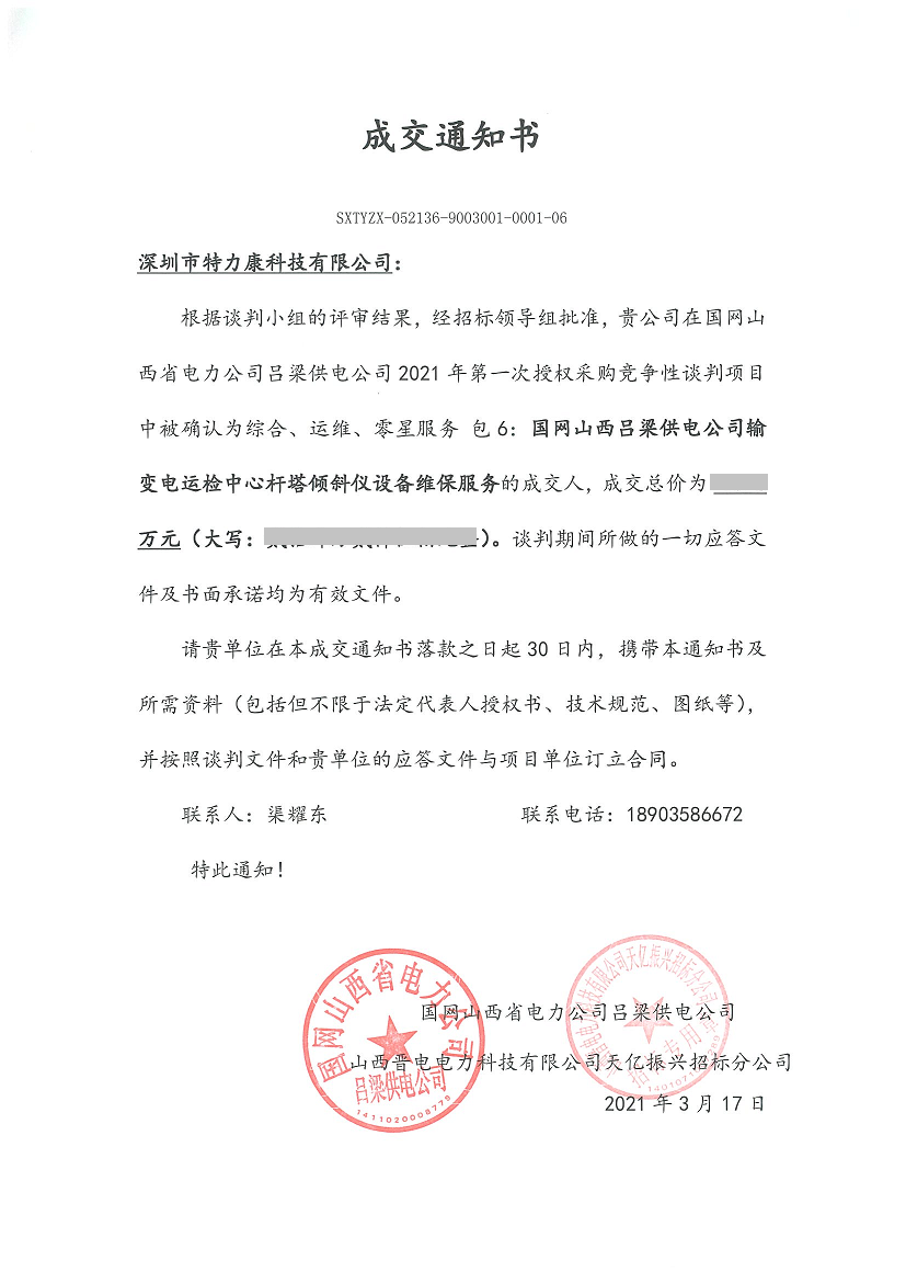 根據(jù)談判小組的評審結(jié)果,經(jīng)招標領(lǐng)導(dǎo)組批準,貴公司在國網(wǎng)山西省電力公司呂梁供電公司2021年第一次授權(quán)采購競爭性談判項目中被確認為綜合、運維、零星服務(wù)包6:國網(wǎng)山西呂梁供電公司輸變電運檢中心桿塔傾斜儀設(shè)備維保服務(wù)的成交人,成交通知如下: