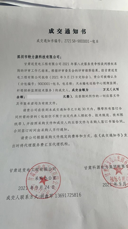 甘肅送變電工程有限公司2021年第八次服務(wù)競(jìng)爭(zhēng)性談判授權(quán)采購(gòu)的評(píng)審工作已結(jié)束。根據(jù)評(píng)審委員會(huì)的評(píng)審?fù)扑]結(jié)果,經(jīng)甘肅送變電工程有限公司批準(zhǔn)(2021 年9月23日定標(biāo)會(huì)),貴公司被確認(rèn)為(分包編號(hào): 9003001-包8, 包名稱:天水輸電運(yùn)檢中心視頻監(jiān)測(cè)、桿塔傾斜監(jiān)測(cè)技術(shù)服務(wù))的成交人,中標(biāo)通知如下: