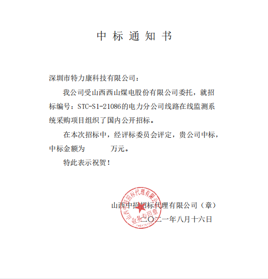 我公可受山西西山煤電股份有限公司委托,就招標(biāo)編號(hào):STC-S1-21086的電力分公司線路在線監(jiān)測(cè)系統(tǒng)采購(gòu)項(xiàng)目組織了國(guó)內(nèi)公開(kāi)招標(biāo)。在本次招標(biāo)中,經(jīng)評(píng)標(biāo)委員會(huì)評(píng)定,我司公司中標(biāo),中標(biāo)公告如下: