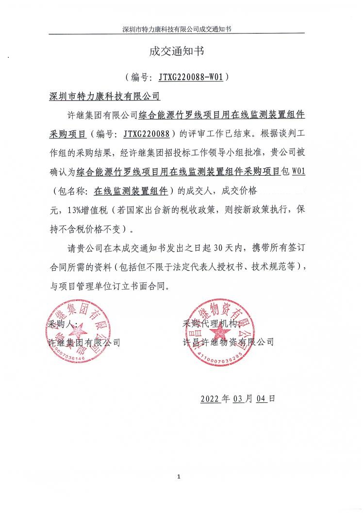 許繼集團有限公司綜合能源竹羅線項目用在線監(jiān)測裝置組件采購項且(編號: JTX6220088)的評審工作已結(jié)束。根據(jù)談判工作組的采購結(jié)果,經(jīng)許繼集團招投標工作領(lǐng)導(dǎo)小組批準,貴公司被確認為綜合能源竹羅線項且用在線監(jiān)測裝置組件采購項目包W01(包名稱:在線監(jiān)測裝置組件)的成交人,成交通知如下: