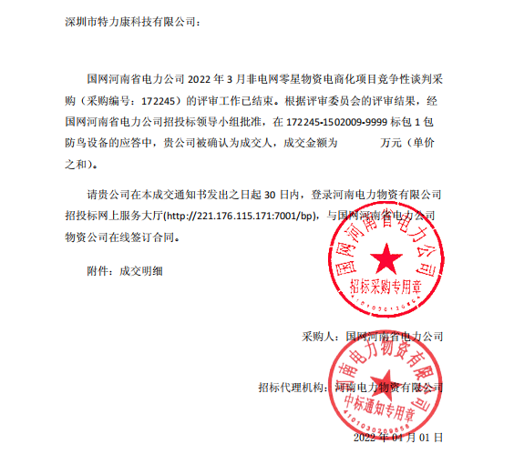國網(wǎng)河南省電力公司2022年3月非電網(wǎng)零星物資電商化項目競爭性談判采購(采購編號: 172245)的評審工作已結(jié)束。根據(jù)評審委員會的評審結(jié)果,經(jīng)國網(wǎng)河南省電力公司招投標(biāo)領(lǐng)導(dǎo)小組批準(zhǔn),在172245-1502009-9999標(biāo)包1包防鳥設(shè)備的應(yīng)答中,我司被確認(rèn)為成交人,成交通知如下: